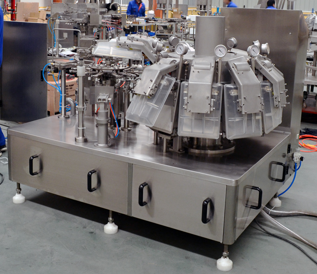 1、該設(shè)備主要有給袋填充旋轉(zhuǎn)系統(tǒng)和真空封口旋轉(zhuǎn)系統(tǒng)組成,真空封口系統(tǒng)為勻速連續(xù)旋轉(zhuǎn)運(yùn)動(dòng)。