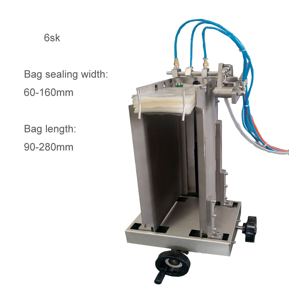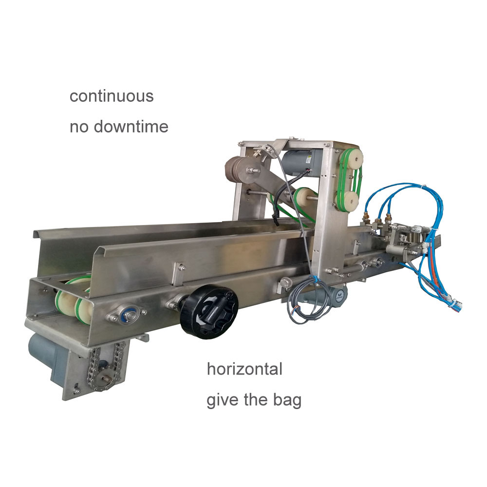 2、下取袋:袋子上取袋部位的上面,通過(guò)吸盤(pán)把袋子吸下來(lái),達(dá)到取袋部位,繼續(xù)下面的工作;其優(yōu)勢(shì)為一次加幾百個(gè)袋子,不停機(jī)連續(xù)加袋子;處于連續(xù)工作狀態(tài);其缺點(diǎn)為對(duì)袋子的厚薄度有要求,既不能太厚也不能太薄,太厚的袋子,吸盤(pán)吸起來(lái)費(fèi)勁,會(huì)降低產(chǎn)品的產(chǎn)能;太薄的袋子,吸盤(pán)吸袋時(shí)會(huì)出現(xiàn)多包現(xiàn)象,造成浪費(fèi),并且在工作過(guò)程中,需要一個(gè)工人在設(shè)備旁邊隨著準(zhǔn)備加袋子,增加工人的工作量。這種給袋方式,在南方給袋式真空包裝機(jī)中常被采用。